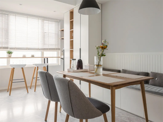 餐桌+吧臺的組合,是現在常見的家居設計,可以將臺面做寬,并與餐桌銜接,既增加了層次感,又豐富了使用功能,減輕餐桌臺面的收納壓力。