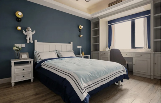為了確保空間的隱私性,我們設計了玄關區域,采用半墻的形式,上半部分選用鐵藝玻璃做搭配,為空間增添了些許趣味性,搭配了美式線條在空間中的描繪,并以灰色作為基調,柔和日光,營造出了溫和優雅而樸實的空間氛圍。