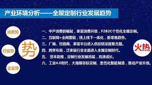 我們把定制行業分為三個勢,三個勢拉動這個行業的發展,第一個是消費勢,第二是行業勢,第三個是企業勢。這幾年定制行業太火了,火到家居產業鏈好像不定制就不能生存。定制怎么火起來的呢?簡單講就是三個勢的拉動,消費升級是整個中國家居行業發展十年來最快的推手,因為消費者對于消費升級有了新的需求。包括整個制造模式,最開始的B2C,到現在變成了C2F,推動了全屋定制的發展。同時互聯網營銷、全網營銷,線上線下一體化,新零售模式;以及廠商、家裝平臺進入供應鏈深度整合;跨界布局,泛家居行業全面進入全屋定制時代;加上資本的助推,定制行業發展迅猛;工業4.0時代,大規模非標定制、柔性化智能制造,推動產業升級。