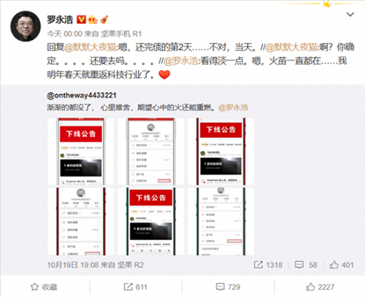 羅永浩表示:“看得淡一點。嗯,火苗一直都在…… 我明年春天就重返科技行業(yè)了。”同時他還強調(diào),是還完債的當天就會回去。