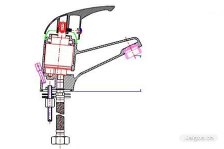 我們以最左邊的孔為熱水出孔,右邊的孔為冷出孔,手柄開關帶動閥桿移動,使圖中綠色陶瓷片移動,左右兩孔被密封,此時就無水進入閥芯。閥芯的地步密封圈使水流必須要經(jīng)過閥芯才能進入主體出水通道,這樣沒有水進入閥芯,那么就沒有水流出管道。這是水管關閉狀態(tài),水龍頭結(jié)構(gòu)與工作原理。