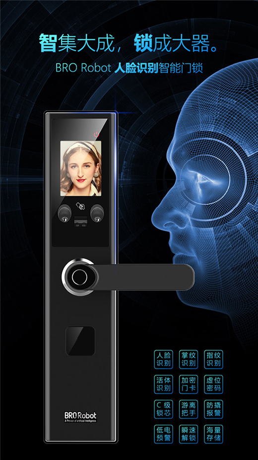 在開鎖模塊上,BRO Robot人臉識別智能門鎖除了具有常規智能門鎖的指紋解鎖、密碼解鎖、鑰匙解鎖、IC卡解鎖的基礎上增加了人臉識別解鎖和掌靜脈識別解鎖的開門方式,指紋、掌靜脈、人臉識別都具有活體檢測功能,安全系數更高。