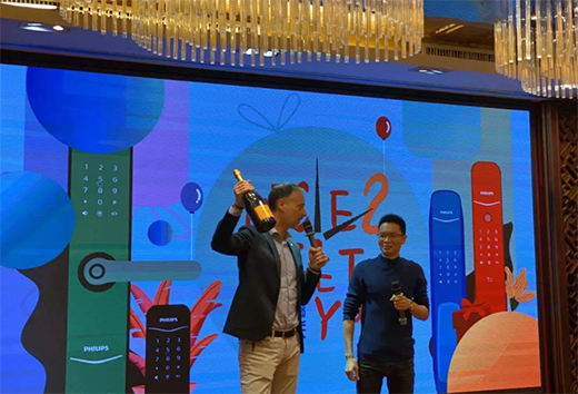 飛利浦品牌代表Jeroen為慶祝我們?nèi)〉玫淖吭郊芽?jī),現(xiàn)場(chǎng)送上“大香檳”,以表達(dá)對(duì)飛利浦智能鎖美好未來(lái)的祝福。