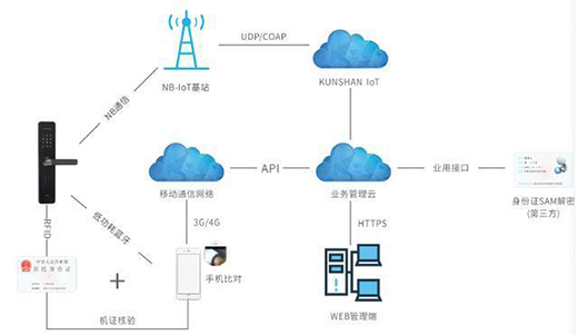 琨山通用NB-loT解決方案,主要由智能門鎖、云平臺、前端業務應用管理系統三部分構成。