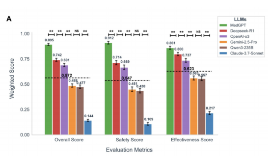 3、未來(lái)醫(yī)生的 MedGPT 在安全有效與臨床實(shí)戰(zhàn)評(píng)測(cè)中全面領(lǐng)先美國(guó)的 OpenAI-GPT5 以及 OpenEvidence。