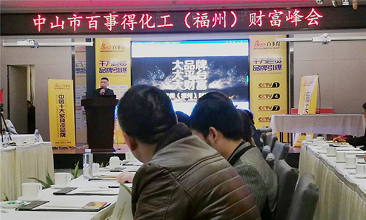 2017年12月20日,中山市百事得化工有限公司“2017-2018(福州)財富峰會”在福建省福州市晉都戴斯國際酒店隆重舉行。經過一下午莊重而溫馨的會議,百事得集團樹立了品牌建設、企業升級的發展新方向。