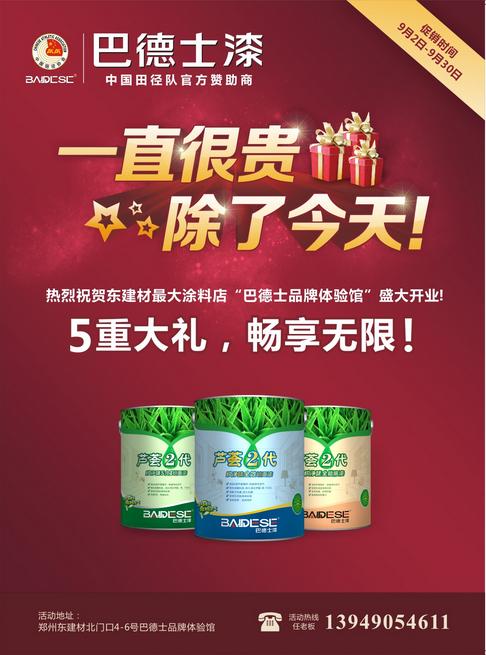 經過巴德士人數月的精心籌備,首家巴德士品牌體驗館即將于9月2日在鄭州盛大開業,屆時將隆重舉辦開業典禮!作為鄭州東建材最大涂料店,“巴德士品牌體驗館”將給巴德士終端形象的提升添上濃墨重彩的一筆!