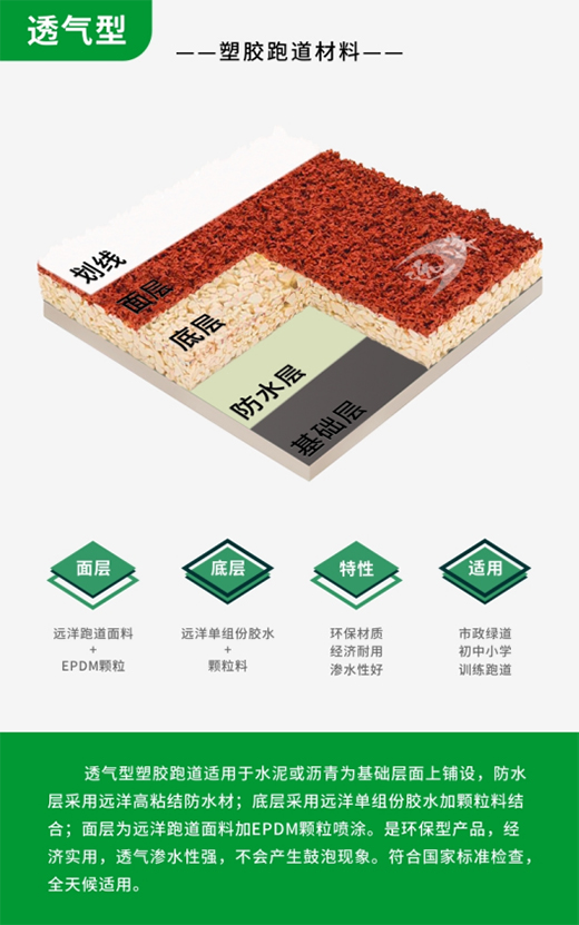2020年10月10日,國務院辦公廳發布《關于加強全民健身場地設施建設發展群眾的意見》,旨在健全促進全民健身制度性舉措、解決群眾“健身去哪兒”難題。《意見》提出,爭取到2025年,解決制約健身設施規劃建設的瓶頸問題,形成群眾普遍參加體育健身的良好氛圍。為此,越來越多的學校、小區等正在全面鋪設跑道球場。但是,在建設的過程中應該選擇哪種材料型的塑膠跑道呢?透氣型、混合型、復合型、預制型?接下來,遠洋體育將為您們簡單介紹一下這四種跑道的區別。