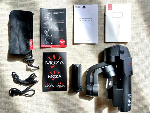 MOZA魔爪Mini-S(尊享版)手持云臺穩定器內包裝為軟塑,產品分區域放置恰到好處,所有配件包括云臺穩定器、三腳架、充電線、3.5mm音頻口手機控制線、收納袋、新手指南、用戶手冊、MOZA貼紙。