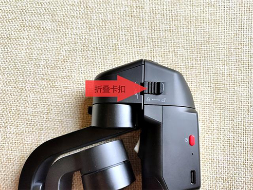 手柄上端為穩定器的折疊卡扣,滑動卡扣在打開時滑動到松開位置,順時針旋轉180度后卡扣會自動鎖緊,需要折疊時也是打開卡扣,逆時針旋轉180度后卡扣會自動鎖緊。