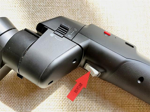 云臺穩定器手柄下方設置了一枚扳機鍵,相當智能的一枚按鍵,拍攝過程中,雙擊就會讓鏡頭歸中,單擊按住扳機鍵就可以切換到俯仰跟隨,雙擊按住就進入全鎖定狀態,在拍攝運動物體時非常好用。