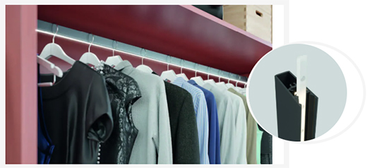橫桿掛衣桿,衣桿托采用免工具快裝固定件固定,隱藏式固定,適用于Häfele Loox LED 燈帶,頂部帶防滑靜音條。附加掛鉤,適用于矩形管狀掛衣桿,可用來收納女士包包,懸掛式收納,合理利用空間。