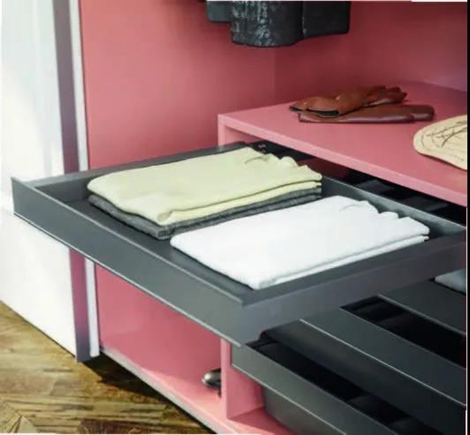 將傳統衣柜最難用的高度徹底利用,并完美釋放衣柜黃金區。用于收納使用頻率高,需要隨時拿取的小物,比如帽盒等。