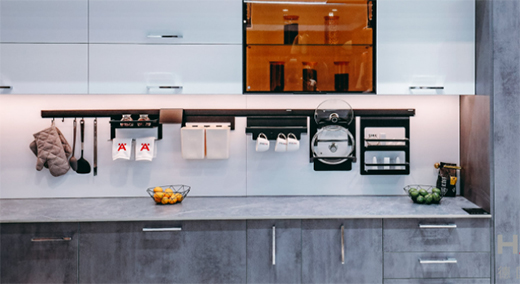 我們的上柜采用海福樂翻門產品,可以做單門上翻、雙門上翻、折疊上翻以及櫥柜煙機前用Freespace實現迷你翻門柜設計。上翻門的使用,可實現多角度停門、控門,避免磕碰,對不同身高人群都很友好。