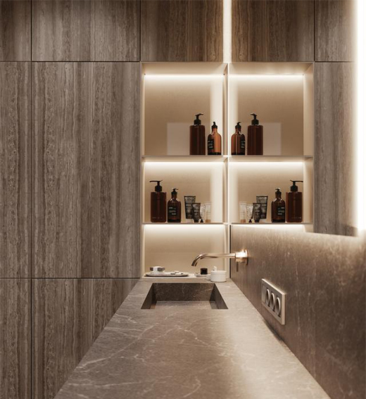 柜體上的燈線設計也比較常見。玄關柜、餐邊柜、櫥柜,中間會有開放式的臺面區(qū)域,因此,上方柜體的底部可以增加燈線來照亮臺面。