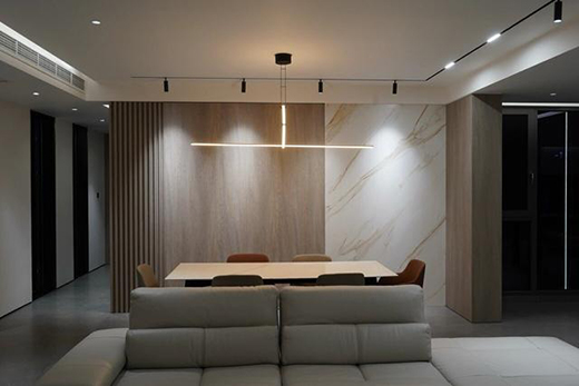 在這套的現代無主燈的設計中,客戶為一家三口,男主人是一名律師,平時辦公的時間會比較多,所以預留了一個書房的空間。而客廳頂面做的無主燈的設計,用防炫目筒燈點綴空間,讓空間有燈光層次感。同時為了做中央空調,對進門的走廊空間做了局部的下掉吊頂,讓吊頂有層次感,能夠從視覺上拉 高整體的空間效果。部分燈光用了暗藏燈帶的手法,見光不見燈,營造現代風格氣息。