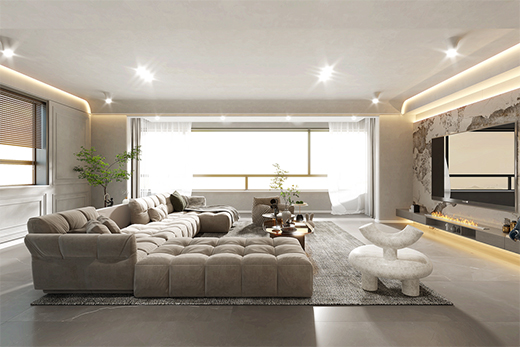 客廳區既獨立又通透,軟包的沙發、厚絨地毯提升幸福指數,裝飾搭配用了啞光的質感,使得整體空間高雅、寧靜、安逸。
