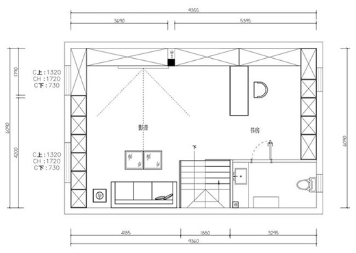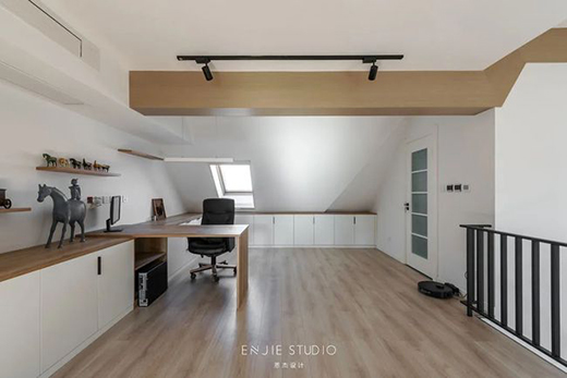 打掉原有墻體,影音室用玻璃做隔斷讓頂部空間更加通透,整圈的儲(chǔ)物+影音室+書房,發(fā)掘頂樓的每一種可能。
