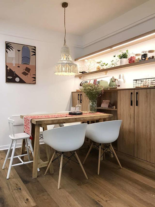 餐廳設(shè)計(jì)了一個(gè)帶有燈帶的餐邊柜,加上編織的吊燈,每天都在享受著浪漫的燭光晚餐。
