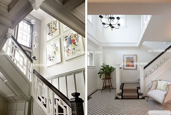 設計技巧:樓梯背景墻的框畫位置擺放也很自由,可以是規矩的并排著,整體的排列因采用了相同的白色相框而不生凌亂之感,同時也降低了圖畫對人們的視覺沖擊。此種修飾令這面墻低調而不單調,完全不會與那精致的樓梯扶欄爭搶風頭。當然也可以是錯落式的設計,這樣的安排豐富了墻面空間,卻不覺雜亂。