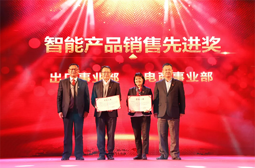 廣晟公司環保安全總監兼環保安全部部長陳思(右一)、佛山照明紀委書記李華山(左一)為獲得智能產品銷售先進獎的部門頒獎