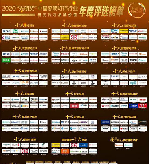 歐普照明、雷士照明、木林森照明、佛山照明、公牛、正泰居家、三雄極光、世林照明、陽光照明、新特麗照明,則以突出表現實力上榜2020"光明獎""十大年度品牌".