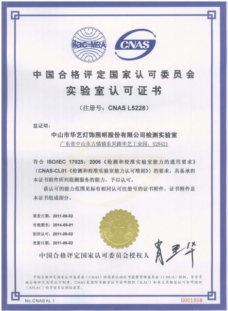 2000㎡華藝燈光檢測實驗室配備精準的檢測設(shè)備和儀器,按照ISO / IEC 17025標準的要求建立完善的產(chǎn)品檢測檢驗管理體系,具備第三方實驗室資格,檢測報告具有國際公信力。實驗室已獲得中國合格評定國家認可委員會 (CNAS)的認可證書,國際實驗室認可合作組織ILAC承認協(xié)議(MRA)成員單位資質(zhì)。