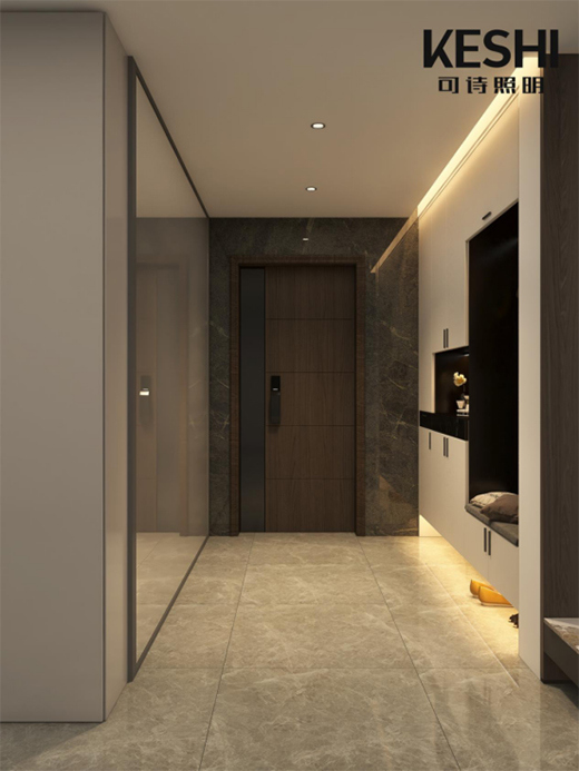 KESHI可詩照明:秉承“以人為本”的設計理念,我們一直所追求的,并不是設計出多么高不可攀的燈光藝術品,而是要為廣大用戶打造出真正能讀懂他們的需求、能給予他們關懷的優(yōu)質燈光環(huán)境。因而,我們的燈光設計方案會根據(jù)不同的家裝風格及用戶個性需求做特別定制,最大程度上尊重用戶的參與和選擇,以期打造出來的燈光環(huán)境并不會與整體家居割裂,反而能相當和諧地融入其中、修飾整體。在打造玄關與過道的燈光設計方案時,我們同樣遵循這樣的工作準則!