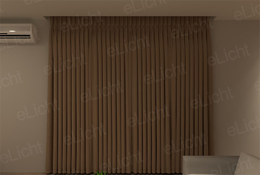 還有一種情況,如果窗簾是安裝在窗簾槽里的,燈具可以選擇安裝在窗簾槽中。像下圖所示就是安置在槽內的窗簾有照明與無照明的對比,這種時候燈具也會一并安裝在槽中,以達成“見光不見燈”的效果。