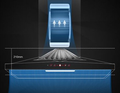 這款吸油煙機的底部橫截面到油網(wǎng)頂部的距離僅有210mm,距離非常短,可深度鎖煙和強勢攏煙。當爆炒油煙被100mm的集煙腔強勢包裹聚攏,經(jīng)過110mm的油網(wǎng)分離過濾,即被瞬間吸走,排出煙道。